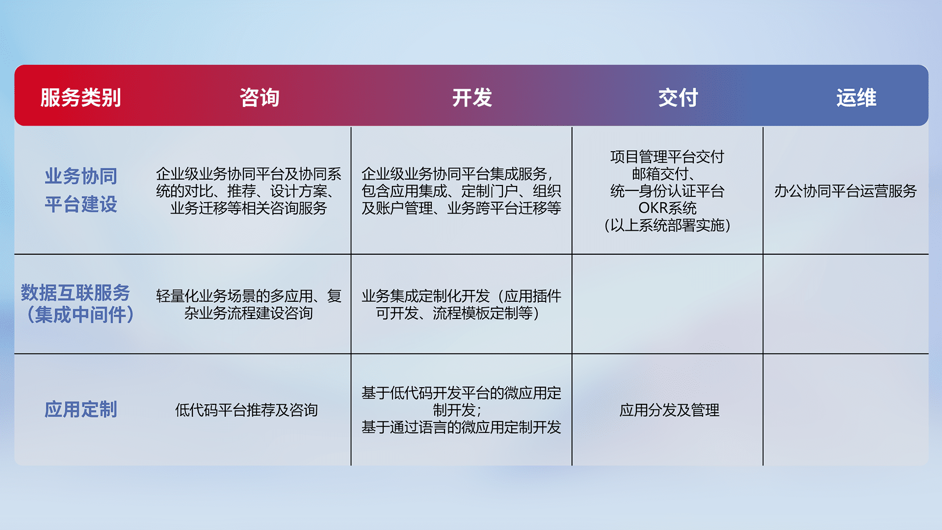 针对钉钉、、企微、、、IDaas等平台级产品提供产品的规划、、、方案、、、交付、、、、定制化开发等服务,,实现如统一协同办公、、、、智能客户服务、、混合会议管理、、、、智能数据查询、、、、等业务场景,,,,实现数字化转型。。。。