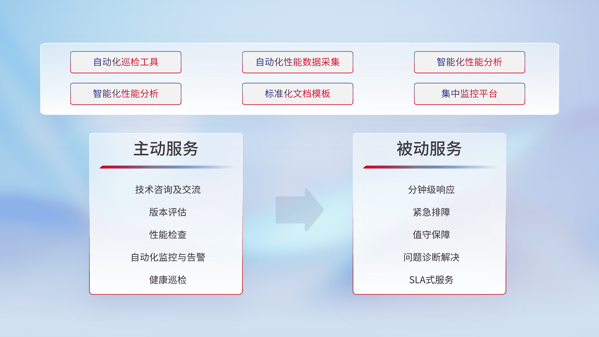 智能化工具和标准化文档,,,,保障服务质量,,提供主动服务(包含技术咨询、、版本评估、、性能检查、、自动化监控与告警、、、健康巡检)和被动服务包含(分钟级响应、、、、紧急排障、、、值守保障、、、问题诊断解决、、、SLA服务)。。。。
